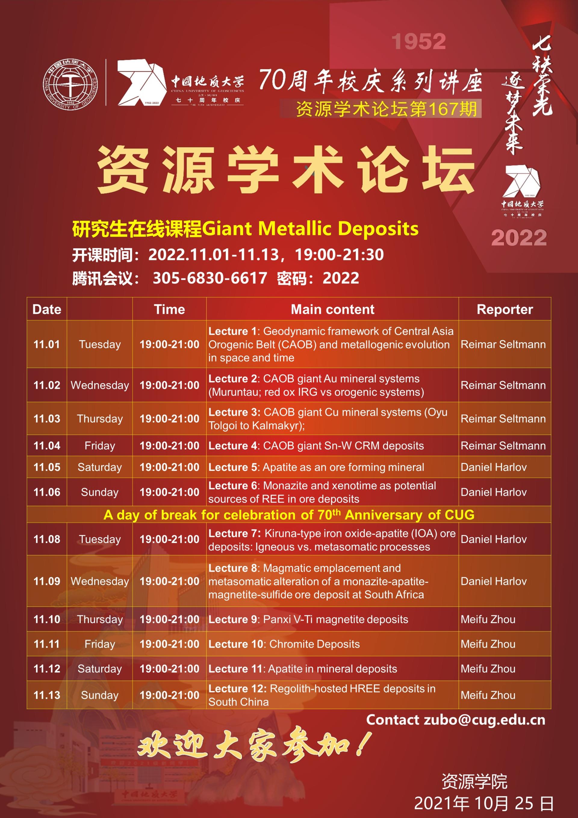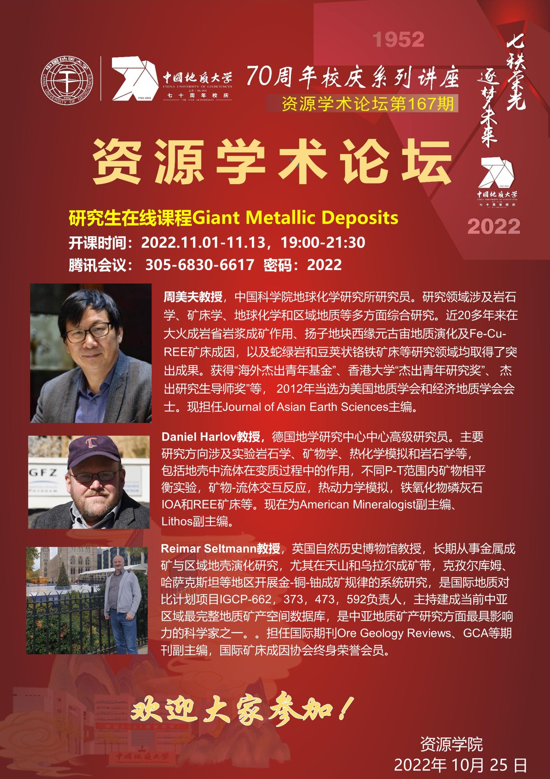 【11月1-13日】第167期资源学术论坛:Giant Metallic Deposits(超大型矿床)