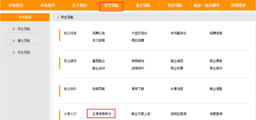在就业网91短视频点击“学生导航”,选择“生源信息核对”。