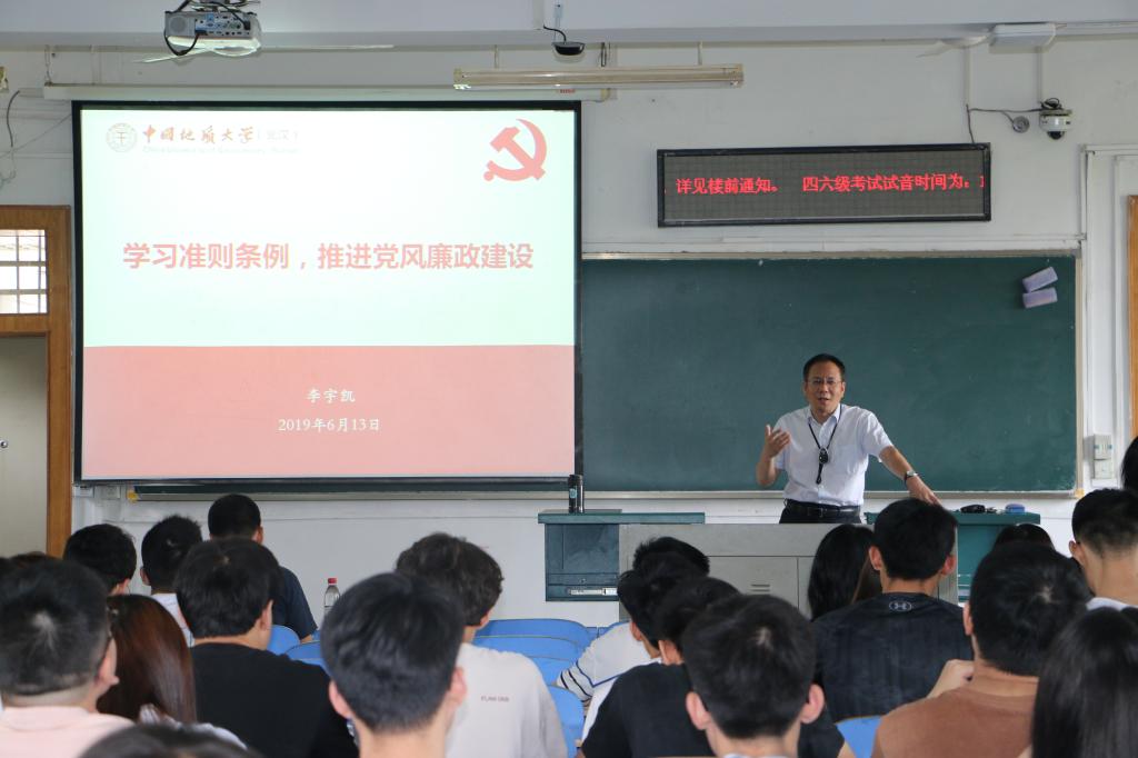 活动伴随着庄严的国歌声和嘹亮的入党誓词正式开始。李宇凯以《学习准则条例,推进党风廉政建设》为题,为与会党员上了一堂严肃又生动的专题党课。他从推进党风廉政建设的意义出发,对《中国共产党廉洁自律准则》、《中国共产党纪律处分条例》、《中国共产党问责条例》、《关于新形势下党内政治生活的若干准则》和《中国共产党党内监督条例》等文件进行解读,着重强调全体党员要把握党风廉政建设的形势与任务。
