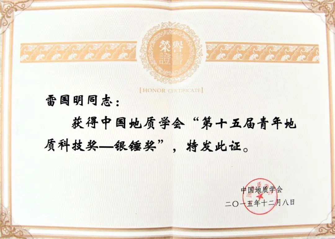 雷国明的辛勤付出和工作实绩得到了同行专家的认可,2018年底,入选了新疆维吾尔自治区非常规能源专家库。在长期的地质找矿实践中,他勤于思考、认真总结、敢于创新,不断提出新的思路和见解,先后在新疆地质等专业期刊上发表15篇论文,其中第一作者8篇。